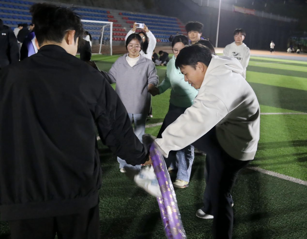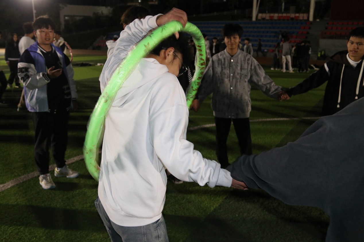 摸石头过河三块砖,一双脚,稳为先。脚踩“石头”步步挪,沉着谨慎,顺利闯过难关!穿越呼啦圈一个呼啦圈,一队人,巧配合。手拉手钻胯传圈,行云流水,协作完成挑战!夹纸竞走一张纸,两只手,一颗心。夹紧纸片稳步行,屏气凝神,携手冲向胜利终点!颁奖聚光灯下,奖杯闪耀,获奖代表依次登台,全场掌声经久不息!