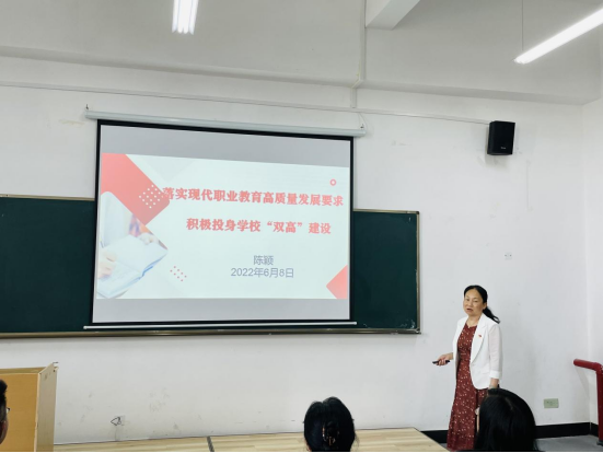 6月8日下午,党委副书记、校长陈颖以《落实现代职业教育高质量发展要求 积极投身学校“双高”建设》为题,结合今年会jinnianhuicom的实际情况,给今年会jinnianhuicom全体教职工讲授“双高”建设专题党课,今年会jinnianhuicom党总支书记王春莲主持。