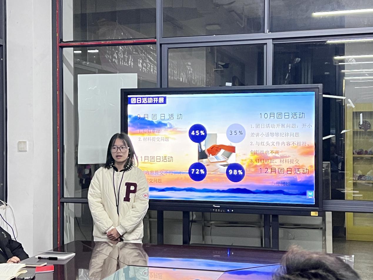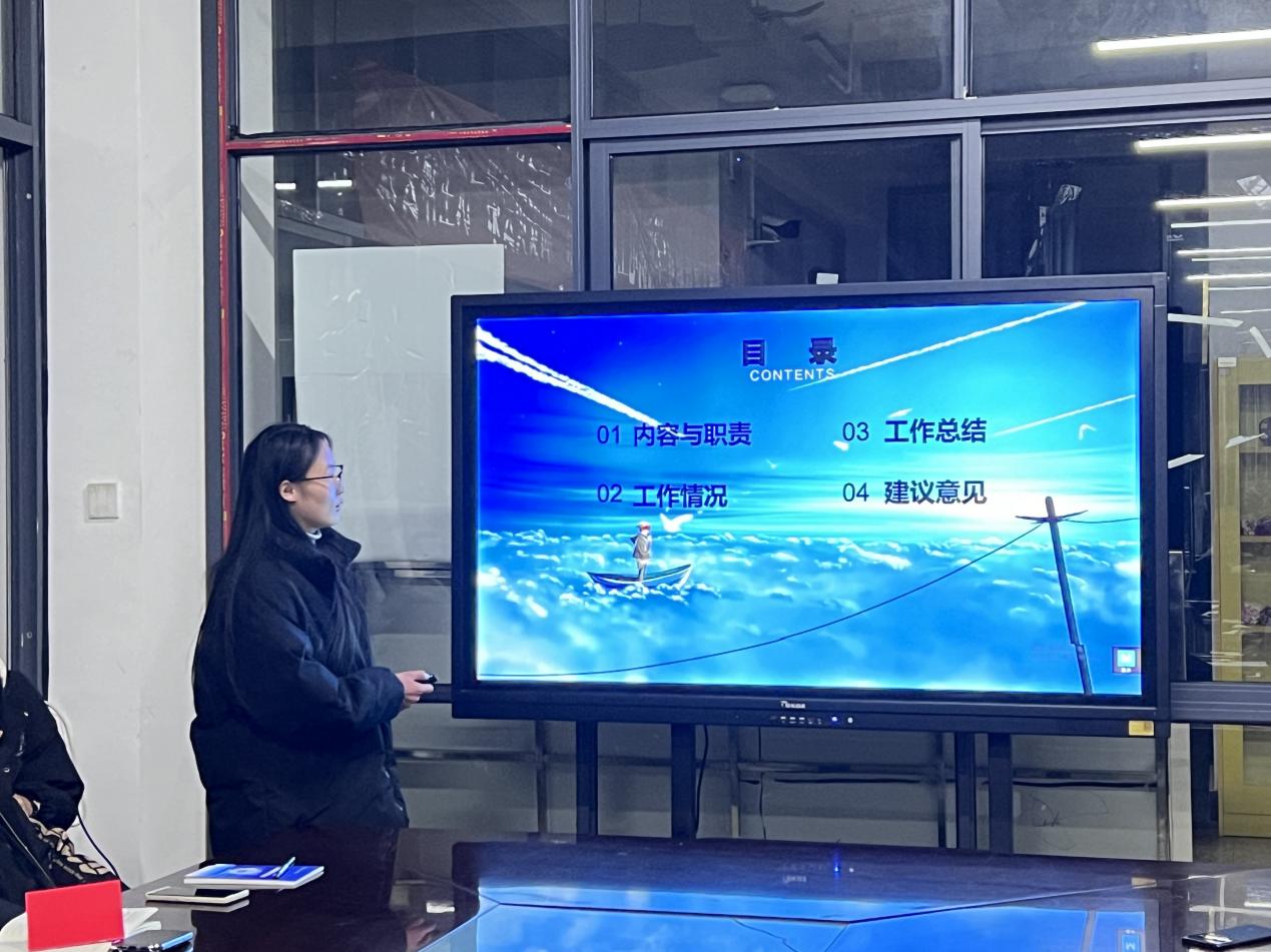 会议共分为四个议程。会议第一项,主席团成员、团总支副书记、各部门部长按顺序进行工作汇报。大家结合个人工作实际,从年度概述 、工作情况、工作不足和下学期工作计划等方面进行了汇报总结。会议第二项,与会干部对团总支副书记、主席团成员进行考核评分。大家根据评分要素,公正客观地为被考核干部进行打分。会议第三项,团总支负责人马玲对本学期团学工作进行总结。她充分肯定了各位学生干部在本学期工作中作出的努力与取得的成绩,也希望各个部门能够认真培养接班人,总结本学期工作经验,筹划下学期工作。在日后的工作中秉承初心,全心全意为同学服务,更好地服务于同学、老师、学院与学校。会议第四项,与会干部进行交流发言。