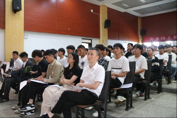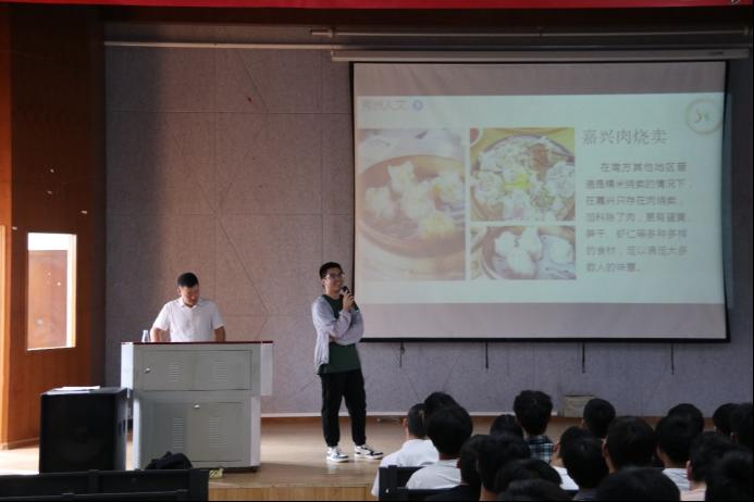 樊鹏奋副主任向同学们介绍了《智能制造在秀洲》,他提到嘉兴秀州的人文风景、地理位置、城市特色等,还介绍了订单班所享受的福利,展示了第一届订单班学生的履历。
