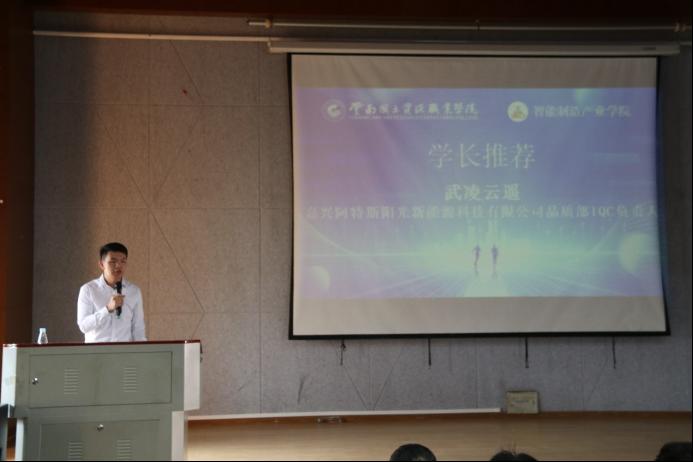嘉兴阿特斯阳光新能源科技有限公司品质部IQC负责人武凌云遥推荐了秀洲的企业,播放了第一届智能制造产业学院学生的在企视频。他希望同学们根据个人情况来选择适合自己的班级。
