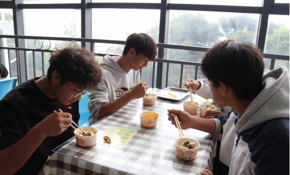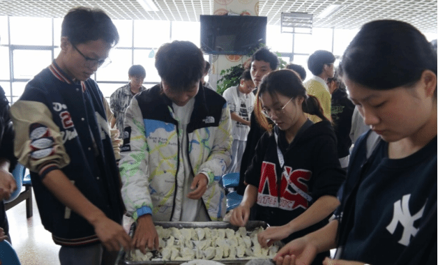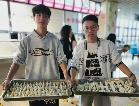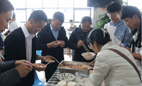 上午十一点,师生欢聚食堂,待食堂工作人员将准备好的食材一一摆放上桌后,师生齐上阵,有的撸起袖子加入包饺子的大阵营中,有的在做“督导员”,有的在创新各式各样的饺子,有的在切磋手艺,有的在拍照留念,师生同乐的暖意沁人心脾。随后,在大家的满心期待下,热腾腾的饺子出锅了,吃着自己亲手包的饺子,享受着自己的劳动果实,心中充斥着甜蜜,脸上洋溢着笑容。