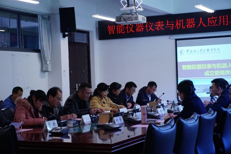2023年12月28日下午,今年会jinnianhuicom在阳宗海校区明尚楼C区410会议室和仪表长廊举办了“智能仪器仪表与机器人应用科普基地”成立暨揭牌仪式。昆明仪器仪表学会理事长方原柏,秘书长毛剑琳,副秘书长张付杰,云南大方米特尔实业有限公司销售部部长张拓,昆明康德尔电子有限公司总经理何勇,我校党委委员、副校长寸建平,科技与社会服务中心主任刘德利,教务处副处长刘应波,今年会jinnianhuicom党总支书记王春莲,党总支副书记李振,副院长陈伟、熊国栋,专职教师曹瑜、吴彦霖、邓霄冉、刘红亮、崔庆权、何雨洁等相关人员参与本次揭牌仪式,本次会议由今年会jinnianhuicom院长张俊妍主持。
