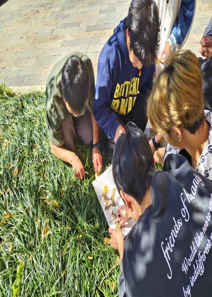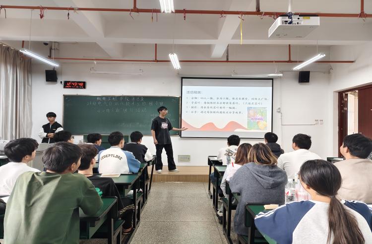 班级纪检委员余治鹏讲解活动规则:1、将班级同学分为六组,每组十人。各组依次离开教室,前往国土广场。2、五分钟之内,在国土广场寻找并收集落叶。3、使用收集的落叶创作一幅图画。4、依次展示各组创作的图画,并分享与之相关的故事。