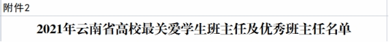 2021年云南省最美高校辅导员、最受学生敬佩辅导员和最关爱学生班主任评选经各学校党委审核推荐,省委教育工委组织专家评审、集中评议、结果复核、对外公示等程序,共评选出“最美高校辅导员年度人物”10名,“最受学生敬佩辅导员”10名,“优秀辅导员”61名,“最关爱学生班主任”10名,“优秀班主任”64名。获评的165名高校辅导员和班主任坚守为党育人、为国育才的初心使命,展现了新时代人民教师昂扬向上的精神风貌 。