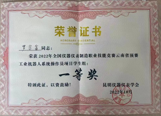 2021级智能控制1班罗宗富荣获2022年全国仪器仪表制造职业技能竞赛云南省预赛工业机器人系统操作员项目(单人赛)学生组一等奖,指导老师于兰获优秀指导教师。