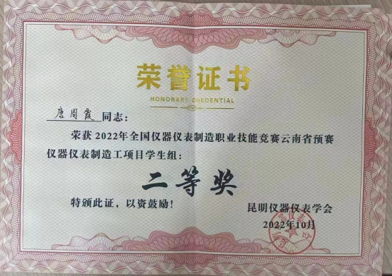 2020级智能控制1班唐周霞、毕健富荣获2022年全国仪器仪表制造职业技能竞赛云南省预赛仪器仪表制造工项目(双人赛)学生组二等奖,指导老师王强卫、崔庆权获优秀指导教师。