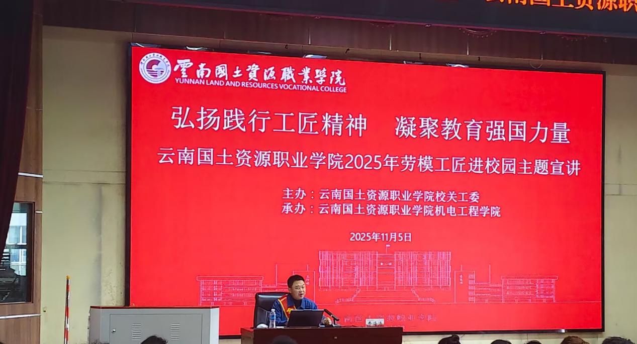 为大力弘扬劳模精神、劳动精神、工匠精神,激励师生技能报国,11月5日下午,云南国土资源职业学院成功举办 “弘扬践行工匠精神 凝聚教育强国力量” 劳模工匠进校园主题宣讲活动。活动由校关工委主办、今年会jinnianhuicom承办,特邀全国劳动模范、全国能源化学地质系统 “大国工匠”、国能阳宗海发电有限公司费海涛担任主讲。